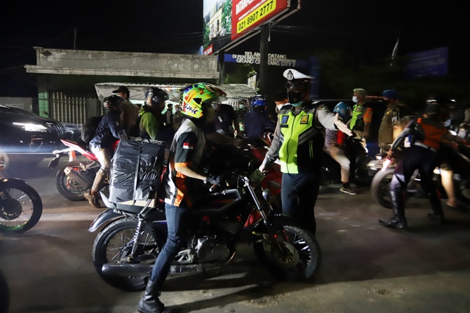 Petugas Kepolisian menghalau pemudik motor di jalur penyekatan mudik di Kedungwaringin, Kabupaten Bekasi, Jawa Barat, Senin (10/5/2021). Pada H-3 jelang Hari Raya Idul Fitri 1442 H petugas gabungan dari TNI, Polri, Dishub dan Satpol PP memperketat penjaga