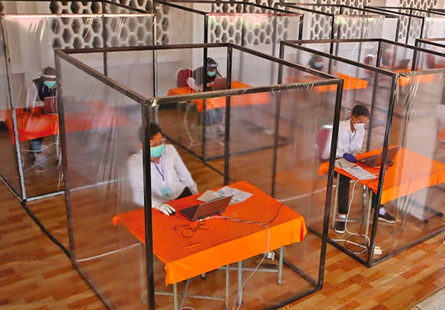 Sejumlah peserta masuk ke bilik plastik untuk mencegah penularan Covid-19. (Frizal/Jawa Pos)