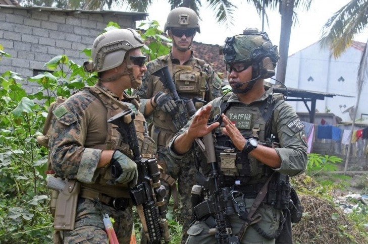 Prajurit Taifib Korps Marinir TNI AL dipimpin Lettu Marinir Adzami Patriot membuat perencanaan untuk pembebasan sandera bersama prajurit USMC Reconnaissance Unit yang dipimpin oleh Captain Nicholas Paparella di posko yang berada di Pusat Latihan Pertempuran Korps Marinir 7 Lampon, Banyuwangi.