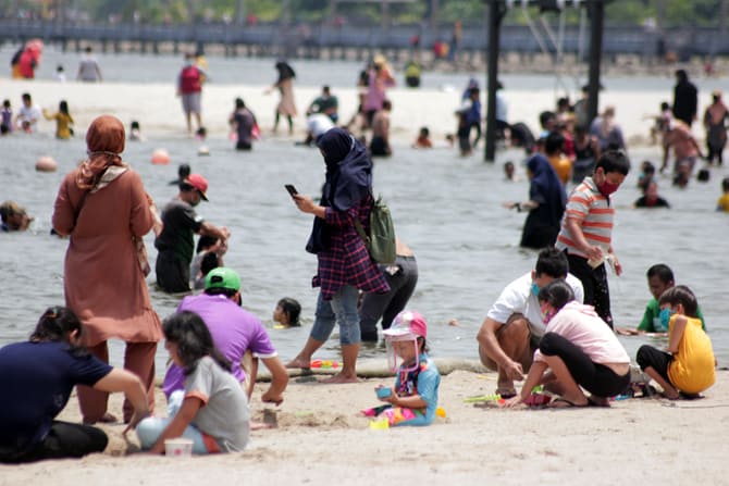 Wisatawan menikmati suasana Pantai Lagoon, Ancol, Jakarta, Kamis (29/10/2020). Libur Nasional dan Cuti bersama dimanfaatkan warga Jakarta untuk bertamasya ke Ancol dan hingga Kamis (29/10) pukul 14.00 WIB pengunjung Ancol mencapai 23.000 orang. Foto: Dery