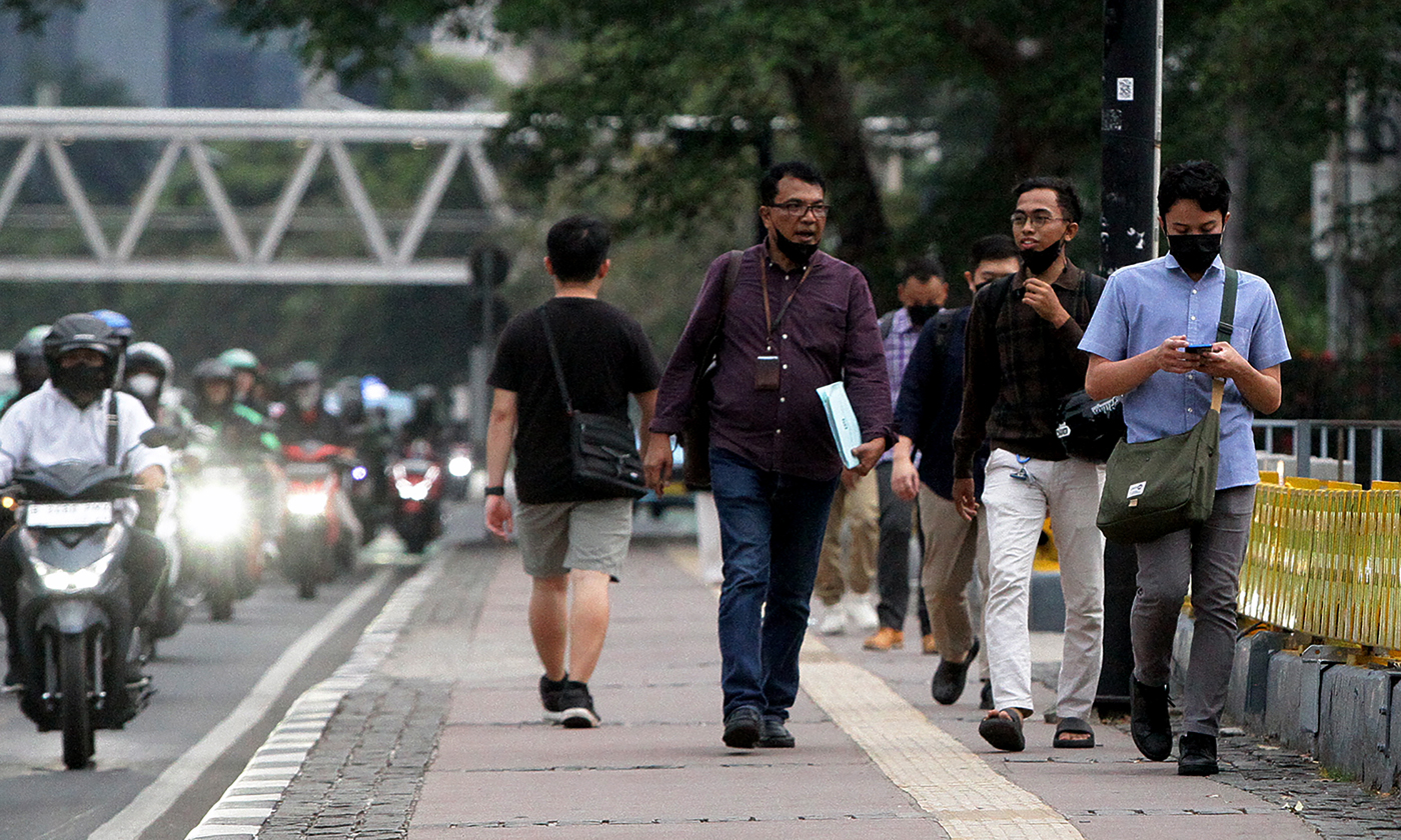 Aktivitas pekerja melintas di crossing, Jalan MH Thamrin, Jakarta, Senin (20/11/2023).