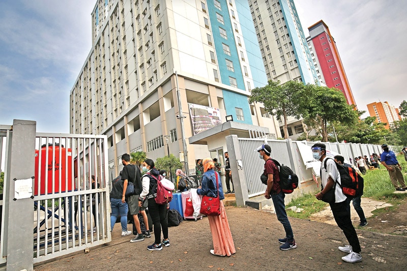 KARANTINA: WNI yang baru tiba dari luar negeri bersiap menjalani isolasi di Wisma Atlet, Jakarta (26/9). (Miftahul Hayat/Jawa PosI)