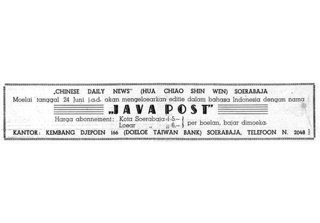 PADA 21 Juni 1949, harian Sin Po (Jakarta) memublikasikan sebuah iklan mengenai kelahiran koran Java Post yang rencananya terbit di Surabaya pada 24 Juni 1949. Java Post merupakan edisi Indonesia dari Chinese Daily News (Hua Chiao Hsin Wen), koran berbahasa Tionghoa terkemuka di Surabaya yang didirikan pada 1946.