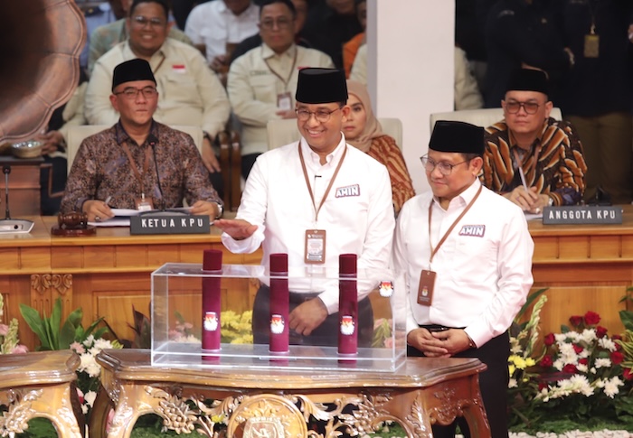Pasangan Anies Muhaimin (Amin) saat melakukan pengambilan nomor urut peserta pilpres di kantor KPU.
