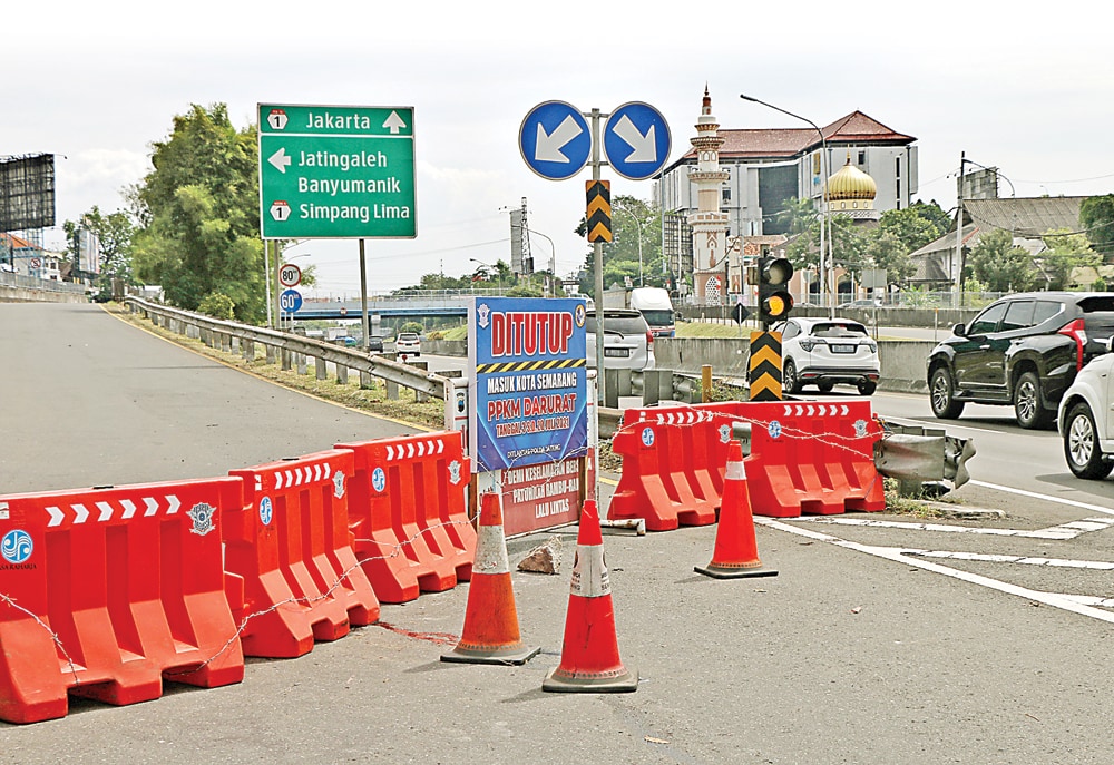 DISEKAT: Pembatasn jalan dipasang di exit toll Jatingaleh, Kota Semarang, sebagai persaiapan penutupan akses kemarin. Sebanyak 27 titik exit toll di Jawa Tengah mulai Pejagan, Brebes, sampai Sragen ditutup pada 16-22 Juli 2021. (NUR CHAMIM/JAWA POS RADAR