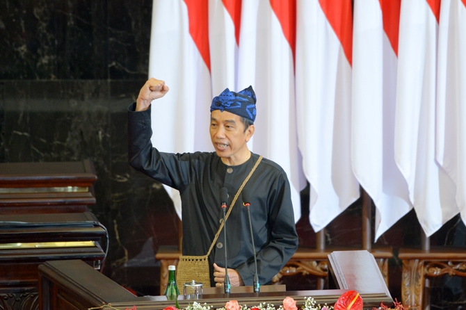 Presiden Joko Widodo mengenakan Baju Adat Suku Baduy menyampaikan pidato penyampaian laporan kinerja lembaga-lembaga negara dan pidato dalam rangka HUT ke-76 Republik Indonesia pada sidang tahunan MPR dan Sidang Bersama DPR-DPD di Komplek Parlemen, Seni