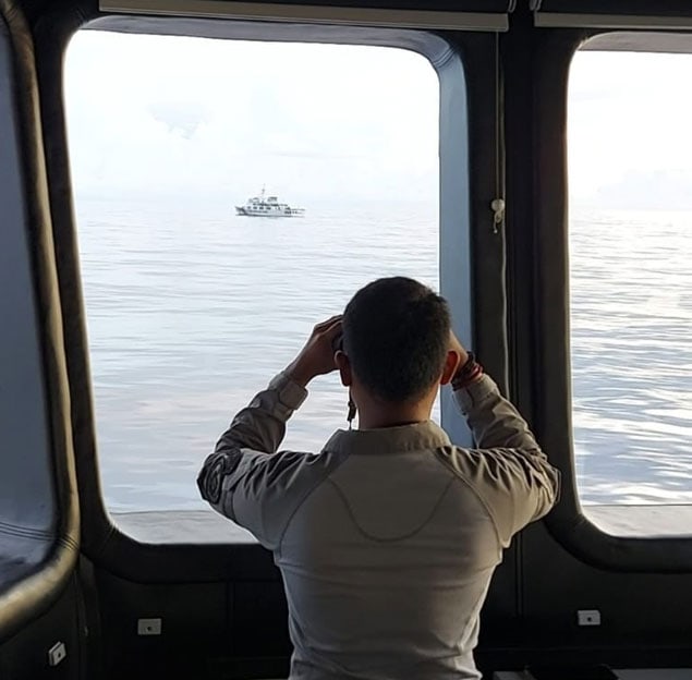 DIHALAU: Petugas mengawasi kapal Coast Guard Tiongkok di Laut Natuna Utara Senin (14/9). (BAKAMLA FOR JAWA POS)