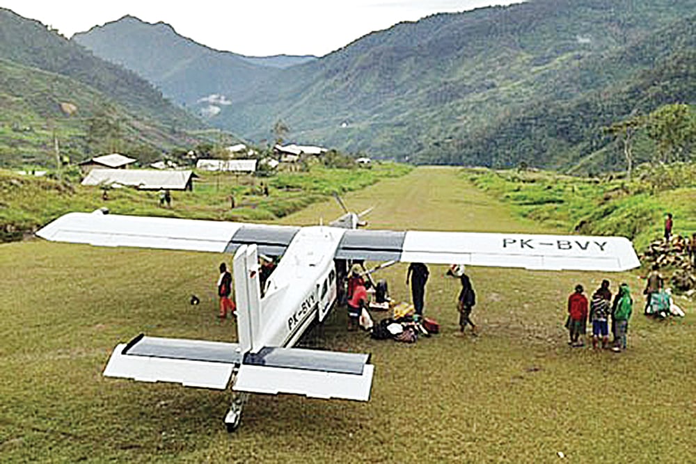 HAPPY ENDING: Pesawat Pilatus Porter Susi Air PK-BVY di salah satu airstip di Papua. Pilot Ian John Terrenca Hellyer didatangi 20 KSB dengan dua pucuk senpi laras panjang di Distrik Wangbe, Puncak, Papua. Setelah ditahan dua, pilot dan tiga penumpang dii
