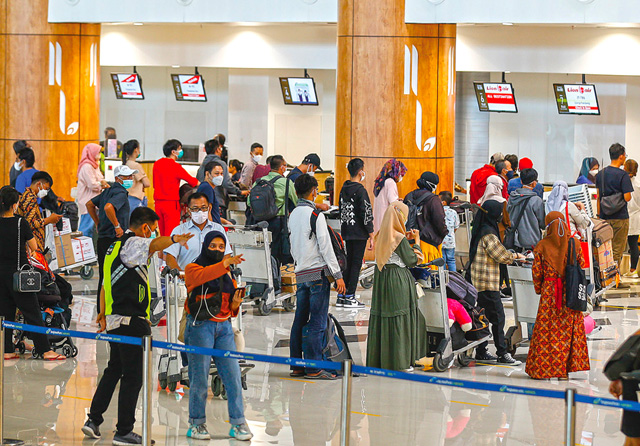 TAMBAHAN SYARAT BEPERGIAN: Para calon penumpang pesawat mengantre di depan konter check-in. Kemenhub menerapkan persyaratan tes PCR mulai Minggu (24/10). (Dipta Wahyu/Jawa Pos)
