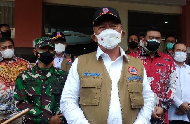 Kepala BNPB Ganip Warsito di tempat isolasi terpusat (isoter) Gedung Pusat Pengembangan dan Pemberdayaan Pendidik dan Tenaga Kependidikan (P4TK) Medan, Jumat (6/8). Antara