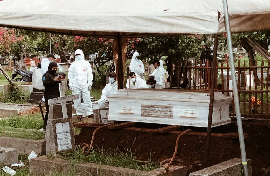 Pada saat prosesi pemakaman dilangsungkan, sejumlah pelayat dari keluarga dan sahabat sedikit menjaga jarak dari liang lahat. Prosesi pemakaman Bens Leo dilangsungkan dengan mengikuti protokol kesehatan Covid-19. Sejumlah petugas tampak menggunakan APD lengkap di pemakaman.