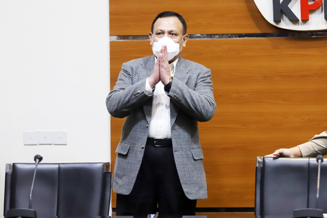 Ketua Kpk Firli Bahuri di gedung KPK, Jakarta, Kamis dini hari (28/4/2022). KPK menetapkan Bupati Bogor Ade Yasin sebagai tersangka suap terkait pengurusan laporan keuangan Pemkab Bogor. KPK juga menangkap Sekdis Dinas PUPR Kab. Bogor Maulana Adam, Kasub