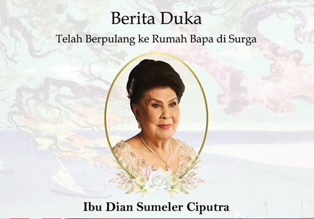 Dian Sumeler Ciputra berpulang dalam usia 89 tahun. Jenazah dijadwalkan dikebumikan pada Jumat (24/12) mendatang.