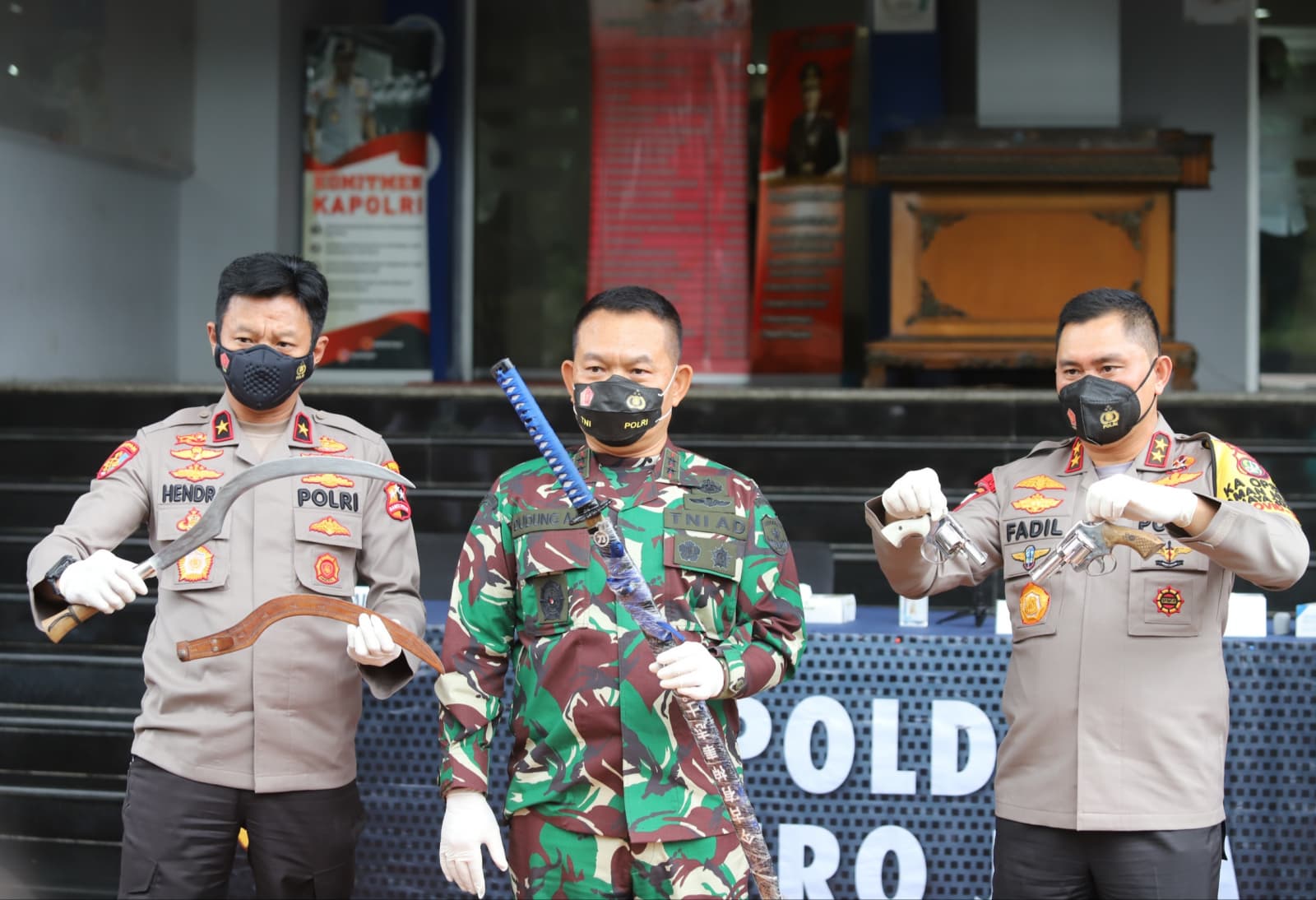Kapolda Metro Jaya Irjen Pol Fadil Imran bersama Pangdam Jaya Mayjen Dudung Abdurachman menunjukan barang bukti saat jumpa Pers di Polda Metro Jaya, Senin (7/12/2020). Polisi menembak mati kelompok yang diduga pendukung Habib Rizieq Shihab (MRS) di Jalan Tol Jakarta Cikampek. Sedikitnya enam orang tewas ditembak polisi karena melawan petugas dengan senjata api dan senjata tajam. Dalam kasus penyerangan terhadap polisi, Polda Metro menyita sejumlah barang bukti, antara lain pistol beserta peluru, katana, dan celurit. Foto: Dery Ridwansah/ JawaPos.com