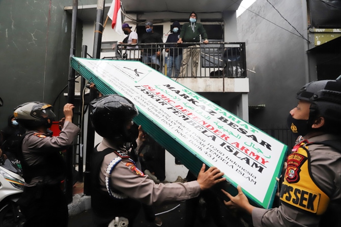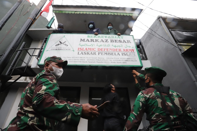 Aparat gabungan TNI dan POLRI mencopot atribut baliho Front Pembela Islam (FPI) di Kantor DPP FPI, Petamburan, Jakarta, Rabu (30/12/2020). Pemerintah secara resmi membubarkan FPI dan melarang segala aktivitas dan kegiatannya karena tidak memiliki kedudukan hukum (legal standing) sebagai ormas maupun organisasi lainnya. Foto: Dery Ridwansah/ JawaPos.com