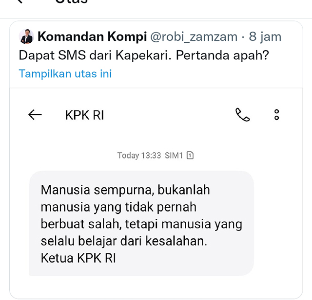 “Manusia sempurna bukanlah manusia yang tidak pernah berbuat salah, tapi manusia yang selalu belajar dari kesalahan. Ketua KPK RI,” demikian isi sms blast yang diposting akun twitter @robi_zam-zam, Minggu (13/2).