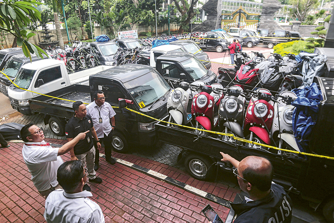 Kendaraan yang sempat ditampung di Gudang Balik PUsziad  Sidoarjo kemarin dipajang di halaman Mapolda Metro Jaya. - Image