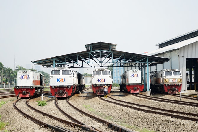 Petugas melalukan perawatan lokomotif di Depo Cipinang, Jakarta Timur, Kamis (29/4/2021). Depo Cipinang, Jakarta Timur, menjadi tempat untuk perawatan lokomotif beragam kereta. Setiap harinya, depo ini melakukan perawatan sebanyak 42 lokomotif. Foto: Der