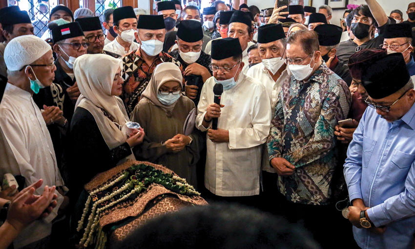 BELASUNGKAWA: Mantan Wapres Jusuf Kalla saat melayat ke rumah duka Fahmi Idris di Jakarta kemarin. (MIFTAHULHAYAT/JAWA POS)