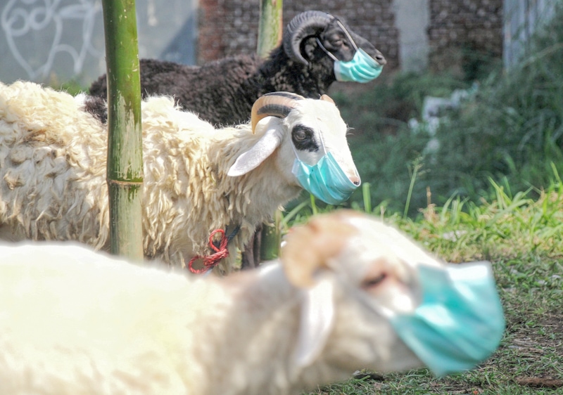 JUALAN DAN KAMPANYE PROKES: Pedagang berkostum badut memasangkan masker pada domba yang dijual untuk keperluan kurban di Bababkan Loa, Kota Cimahi, kemarin (13/7). (TAOFIK ACHMAD HIDAYAT/JAWA POS)