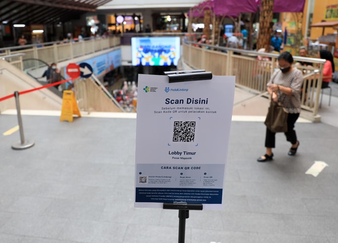 Pengunjung melakukan scan aplikasi PeduliLindungi di Pasar Mayestik, Jakarta, Sabtu (02/10/2021). Pemerintah akan melakukan uji coba penerapan aplikasi PeduliLindungi di enam pasar tradisional. Pasar tersebut tersebar dari Jakarta, Jawa Barat (Jabar), dan