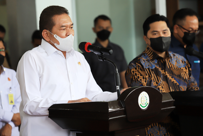 Menteri BUMN Erick Thohir dan Jaksa Agung ST Burhanuddin dalam konferensi pers di Gedung Kejaksaan Agung (Kejagung), Kebayoran Baru, Jakarta, Selasa (11/2/2022). Kedatangan Menteri BUMN Erick Thohir melaporkan dugaan korupsi di lingkungan PT Garuda Indon