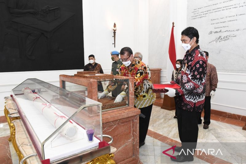 Sekretariat Presiden (Setpres) menempatkan naskah asli teks proklamasi di Istana Merdeka Jakarta pada Selasa (16/8/2022). ANTARA/Kris - Biro Pers Sekretariat Presiden