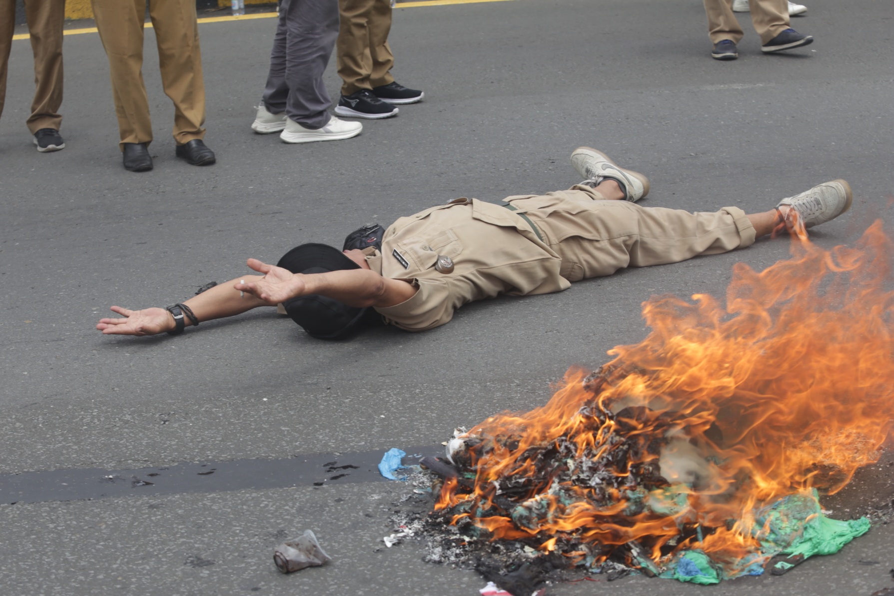 "Alhamdulillah enggak ada. Kita kan dilengkapi dengan helm, dengan tameng, kita bisa ngeliat ke atas ada lemparan batu-batu dan botol. Kalau botol sih saya rasa kalau kena enggak papa kecuali kalau ada isinya," pungkas Karyoto.