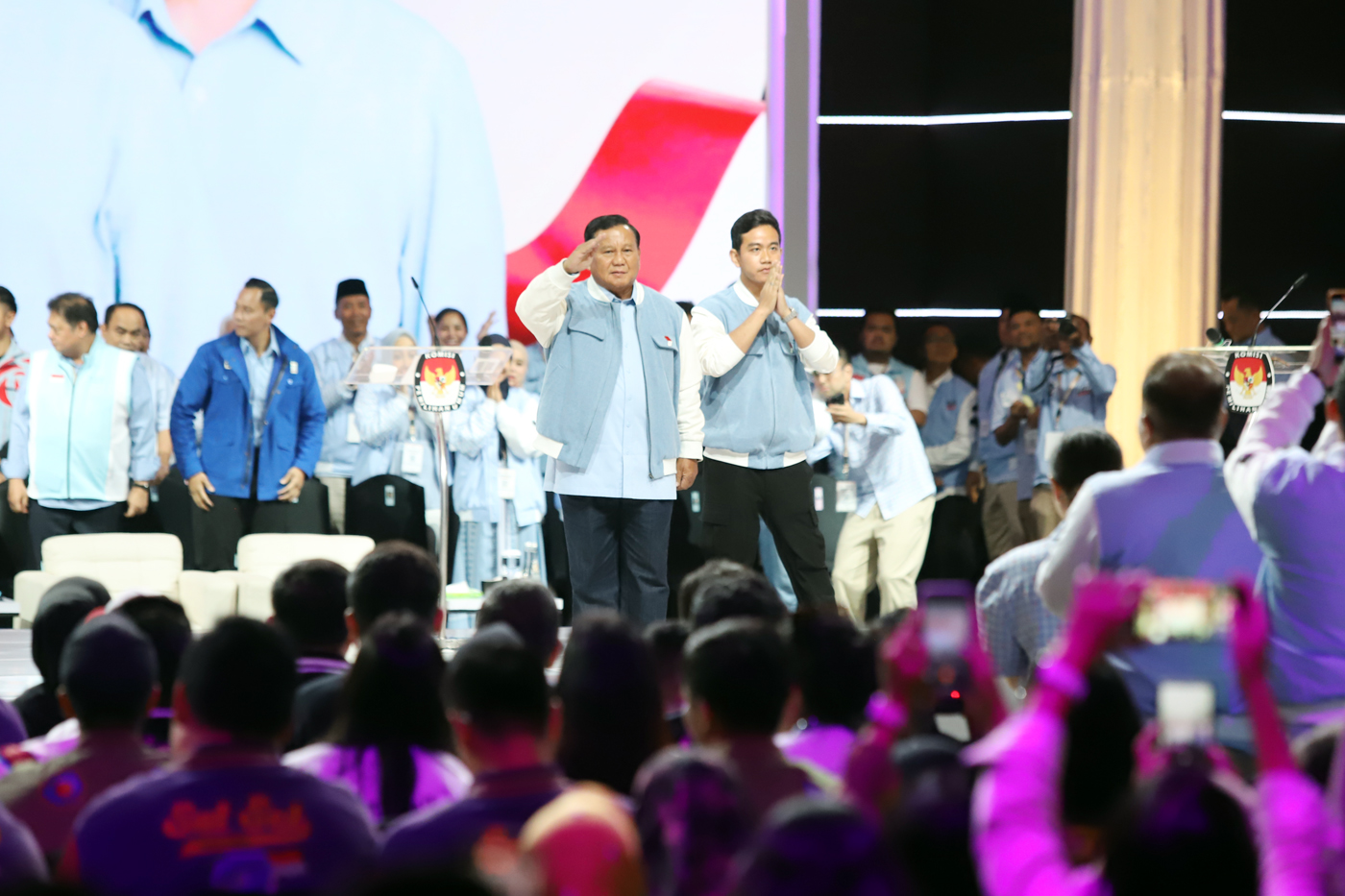 Capres-cawapres nomor urut 2 Prabowo Subianto dan Gibran Rakabuming Raka menyapa para pendukung saat tiba di lokasi debat kelima Pilpres 2024 di Balai Sidang Jakarta Convention Center (JCC) Senayan, Jakarta, Minggu (4/2/2024).