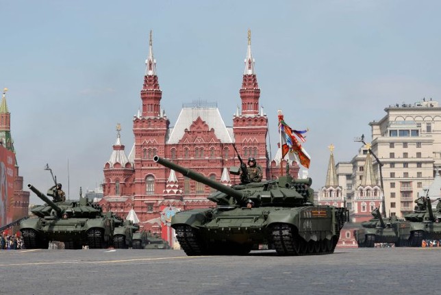 Sejumlah tank Rusia berjalan melewati Lapangan Merah saat latihan parade militer di pusat Kota Moskow, Rusia, Sabtu (7/5). Maxim Shemetov /Reuters/Antara ​​​​​​​