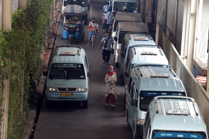Deretan angkutan kota (Angkot) di Stasiun Tanah Abang, Jakarta, Selasa (1/6/2021). Berdasarkan data dari Dinas Perhubungan DKI Jakarta, jumlah penumpang harian angkutan umum di Ibukota turun hingga 58,44 persen. Foto: Dery Ridwansah/ JawaPos.com