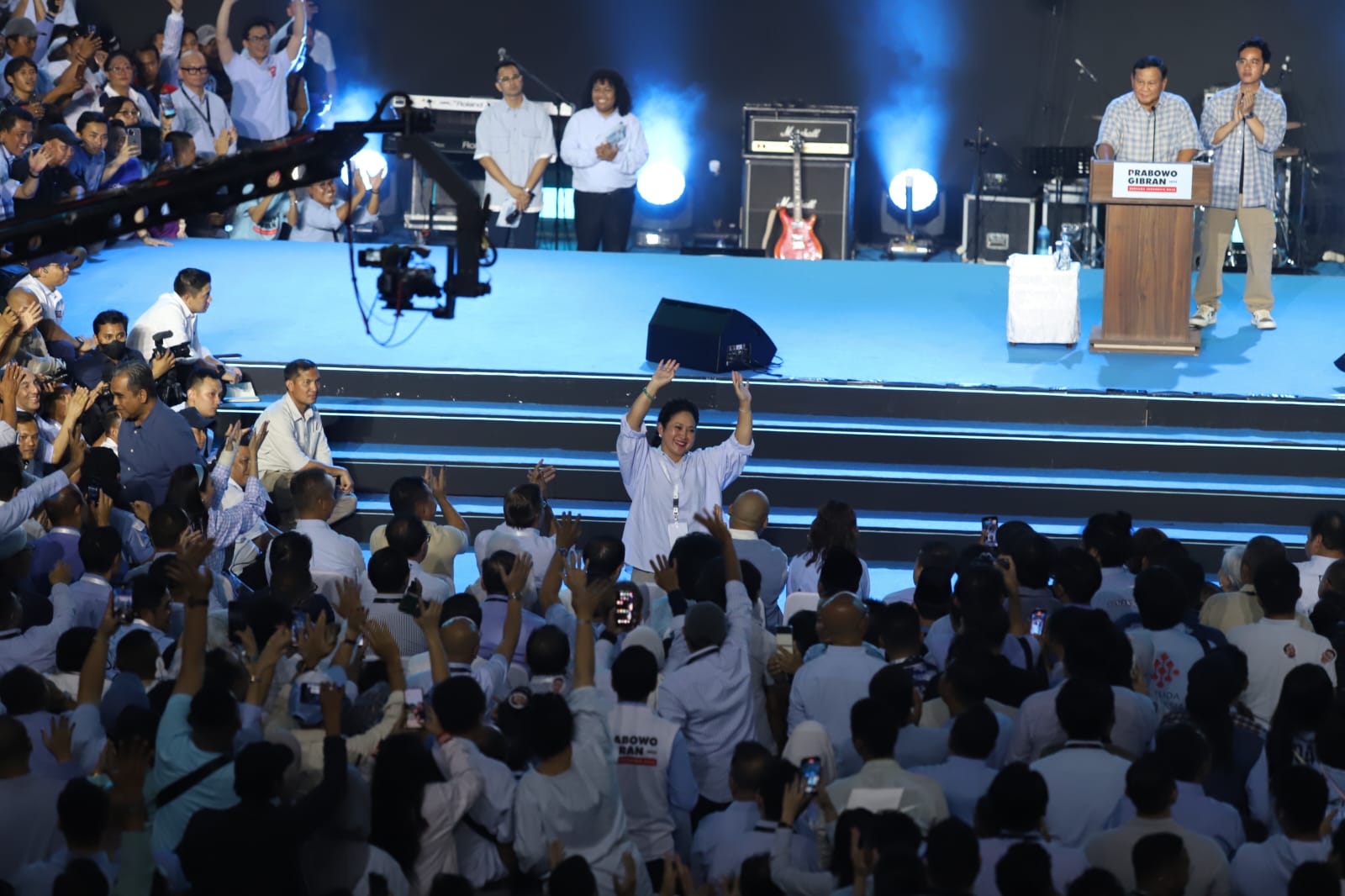 Siti Hediati Hariyadi alias Titiek Soeharto nampak hadir mendampingi Prabowo saat melakukan pidato kemenangan di Istora Senayan, Jakarta Pusat, Rabu (14/2) malam. (Dery Ridwansah/ JawaPos.com)