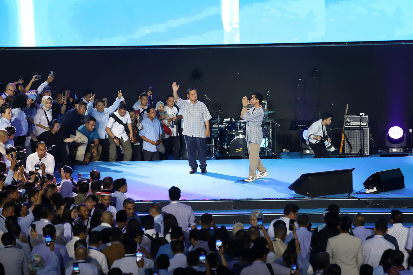 Calon presiden dan calon wakil presiden nomor urut 2 Prabowo Subianto dan Gibran Rakabuming Raka menyapa pendukungnya saat menghadiri acara pemantauan hasil quick count di Istora Senayan, Jakarta, Rabu (14/2/2024).