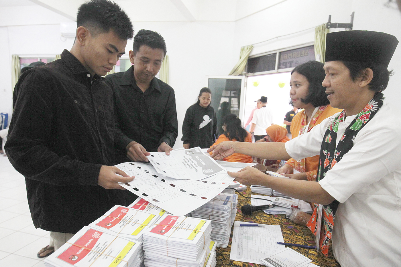 Petugas KPPS menyerahkan surat suara kepada warga saat hari pencoblosan.
