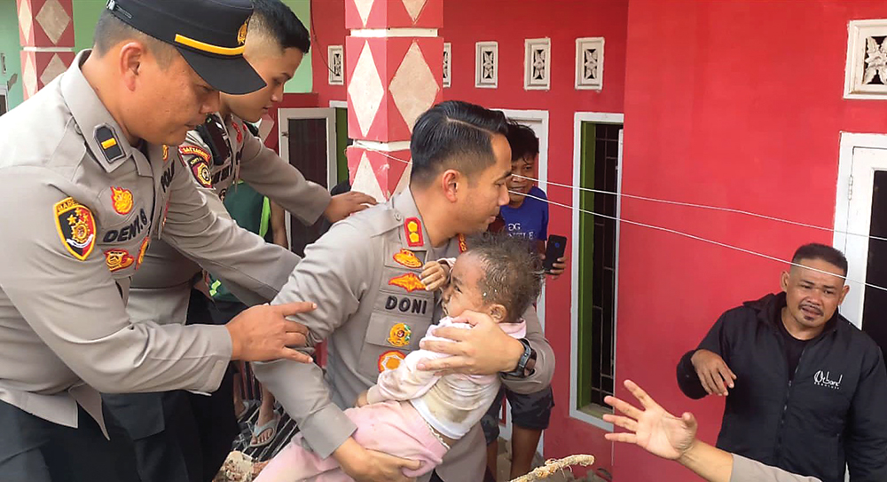 PERTOLONGAN PERTAMA: Kapolres Cianjur AKBP Doni Hermawan mengevakuasi seorang anak korban reruntuhan akibat gempa Cianjur kemarin. (POLRES CIANJUR UNTUK RADAR CIANJUR)