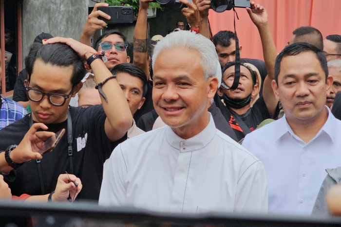 Calon presiden (capres) nomor urut 3 Ganjar Pranowo usai menggunakan hak suaranya di TPS 011, Lempongsari, Gajah Mungkur, Semarang, Jawa Tengah, Rabu (14/2). (Foto: Ridwan)