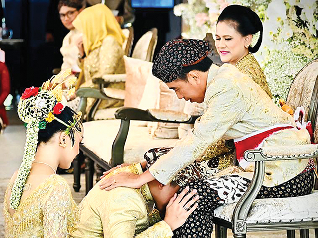 RESTU ORANG TUA: Kaesang didampingi Erina bersimpuh mencium kaki Jokowi setelah akad nikah di Pendopo Agung Royal Amabarrukmo, Sleman, Jogjakarta, kemarin (10/12). Hari ini prosesi dilanjutkan dengan acara resepsi dan ngunduh mantu di Solo. (LAILY RACHEV/