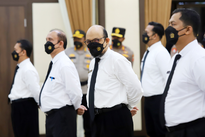 Mantan penyidik Komisi Pemberantasan Korupsi (KPK) Novel Baswedan bersama sejumlah mantan pegawai KPK saat mengikuti pelantikan di Gedung Rupatama, Mabes Polri, Jakarta Selatan, Kamis (9/12/2021). Sebanyak 44 mantan pegawai KPK akan mengikuti pelantikan m