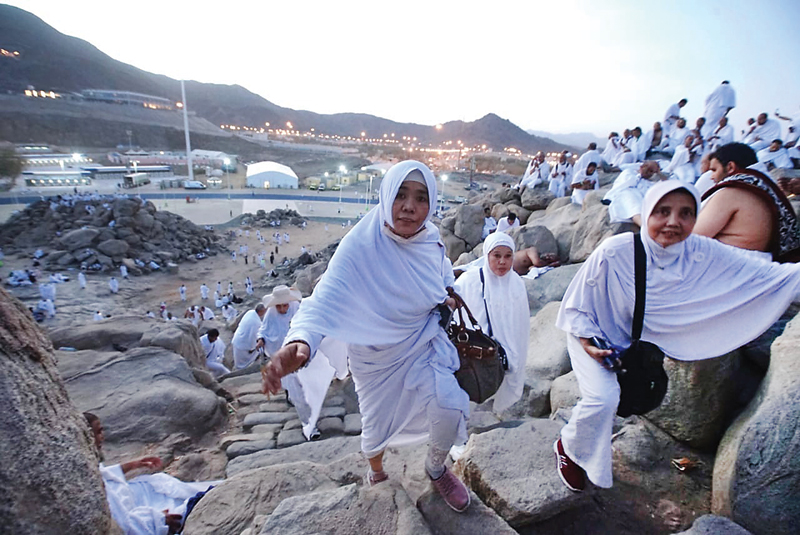 SEBELUM WUKUF: Jemaah haji naik ke Bukit Jabal Rahmah yang terletak di dekat Masjid Namirah di Arafah kemarin (8/7). (MEDIA CENTER HAJI)