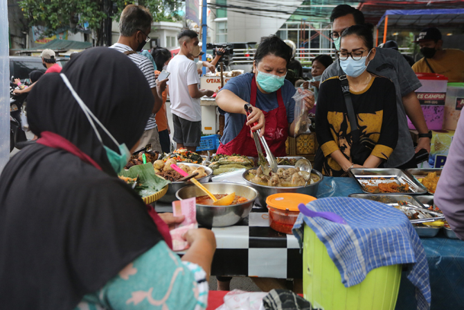 Suasana di Pasar Takjil Benhil, Jakarta, Minggu (3/4/2022). Seiring dengan turunya status PPKM Jakarta dan status ekonomi indonesia yang mulai kembali pulih, pasar takjil yang ada setiap bulan Ramadhan tersebut kembali dipadati warga untuk membeli makanan