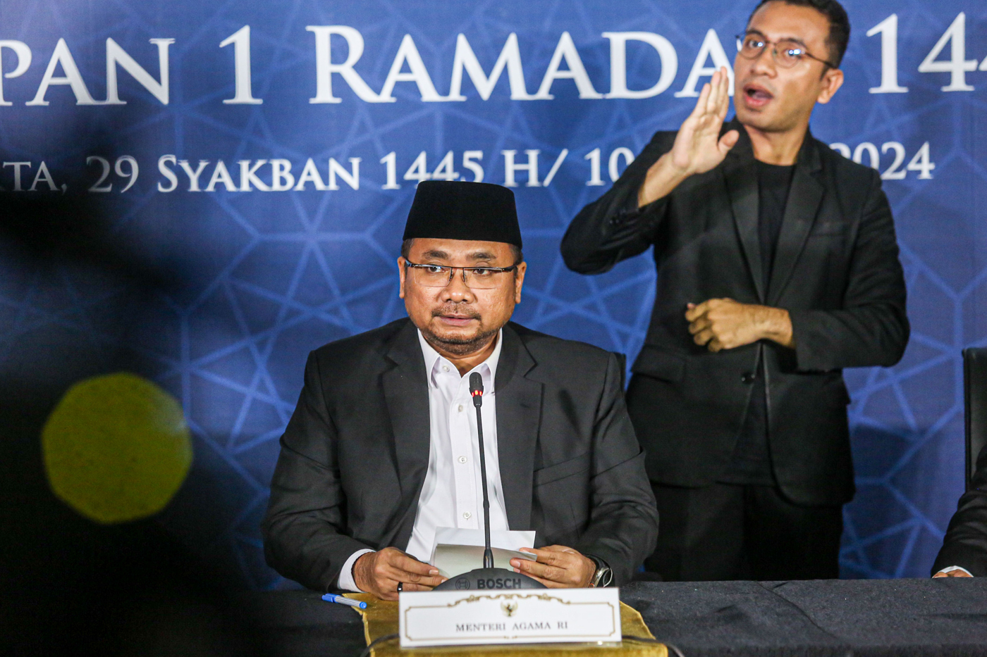Mentri Agama Yaqut Cholil Qoumas memberikan keterangan hasil Sidang Isbat di Gedung Kementrian Agama Republik Indonesia, Jakarta, Minggu (10/3/2024).