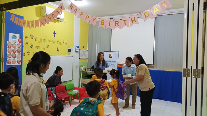 Para relawan tersebut menyambangi dua sekolah yakni TK Happy Holly Kids dan TK Calvary. Mereka memberikan puluhan paket makan siang sehat dan bergizi yang diproduksi dari dapur khusus. Total 60 paket telah dibagikan.