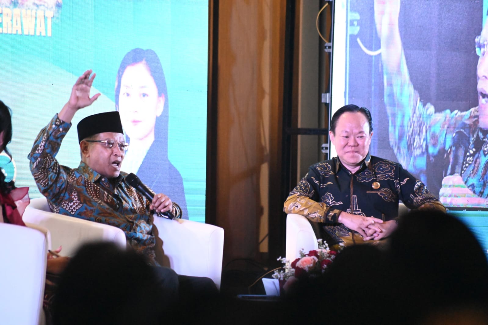 Mantan Ketum PBNU 2010-2021 Said Aqil Siroj (kiri) berbicara soal toleransi di Sekolah Tinggi Agama Buddha Nalanda (16/3) malam. Hilmi/Jawa Pos