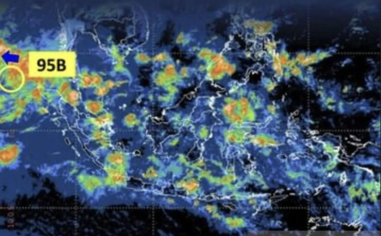 BMKG mendeteksi bibit siklon tropis 95B di Samudra Hindia barat yang mempengaruhi pertumbuhan awan hujan di sejumlah kota besar di Indonesia, Kamis (30/11). Sumber: BMKG