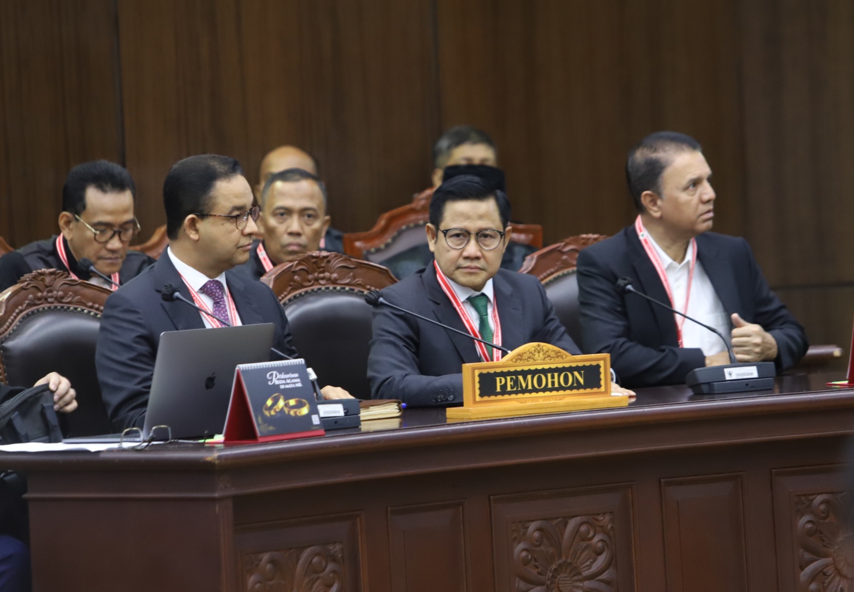 Kubu Calon presiden dan calon wakil presiden nomor urut 1 Anies Baswedan dan Muhaimin Iskandar hadir dalam sidang putusan perselisihan hasil Pilpres 2024 di Gedung MK, Jakarta.