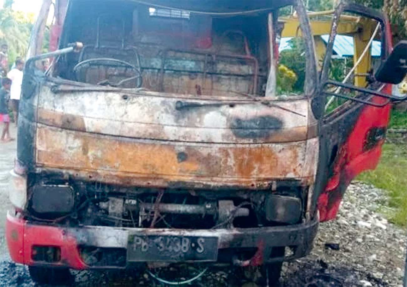 HANGUS: Salah satu truk yang dibakar orang tak dikenal di Yapen.