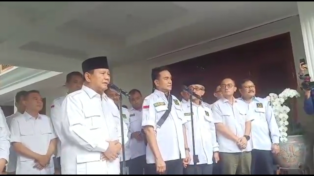 Ketua Umum Partai Gerindra Prabowo Subianto usai melakukan pertemuan dengan jajaran DPP Partai Bulan Bintang (PBB) yang dipimpin Yusril Ihza Mahendra