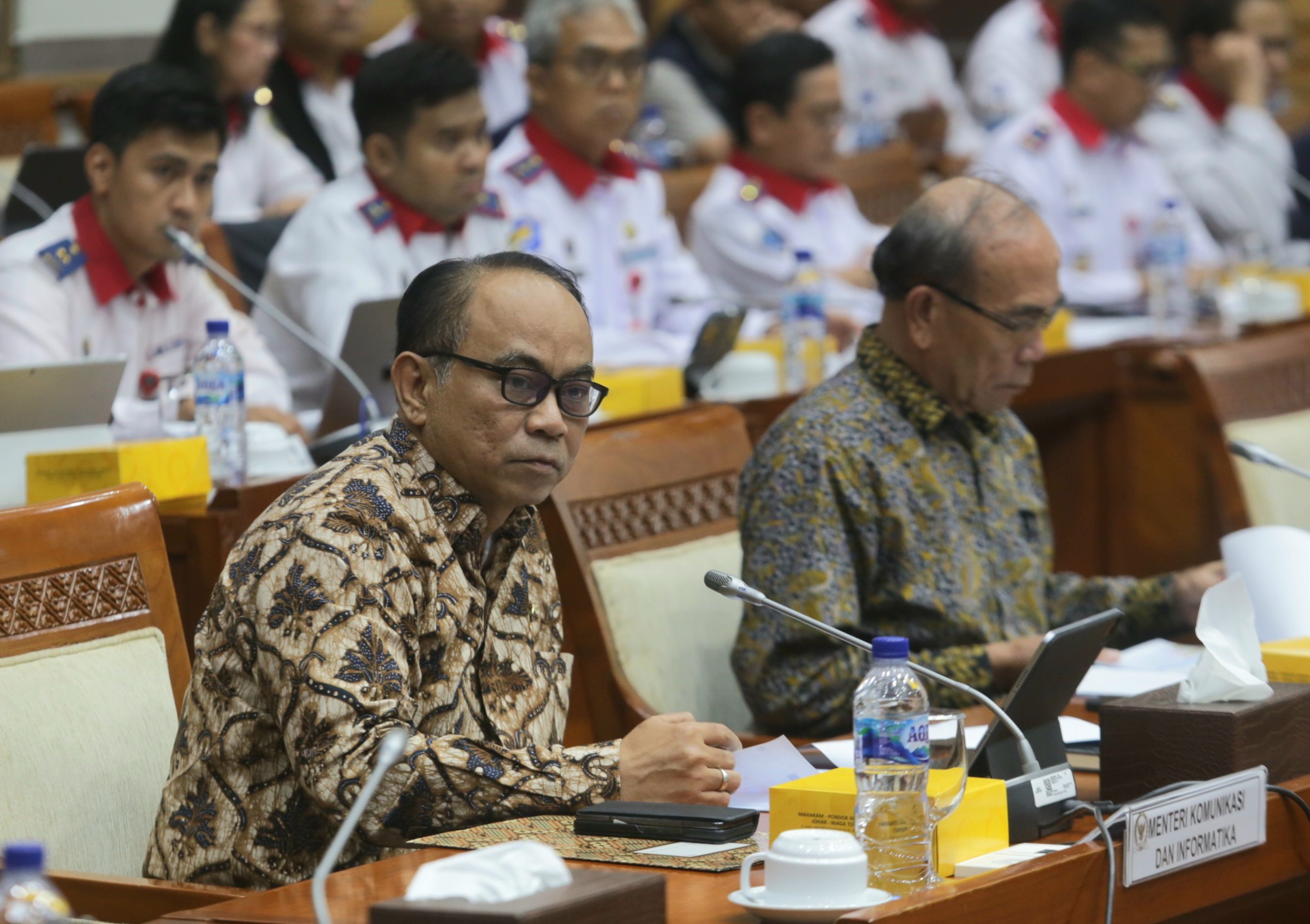 Menkominfo Budi Arie Setiadi dan Kepala BSSN Hinsa Siburian saat mengikuti Raker dengan Komisi I DPR, di Jakarta, Senayan, Kamis (27/6/2024).