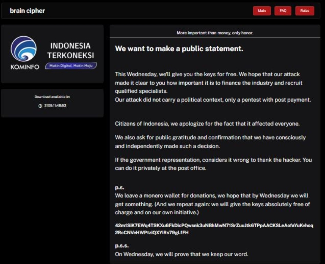 Selain itu, kelompok Brain Cipher itu juga meminta maaf kepada Indonesia atas gangguan tersebut. Mereka meminta pengakuan publik atas keputusan mereka.