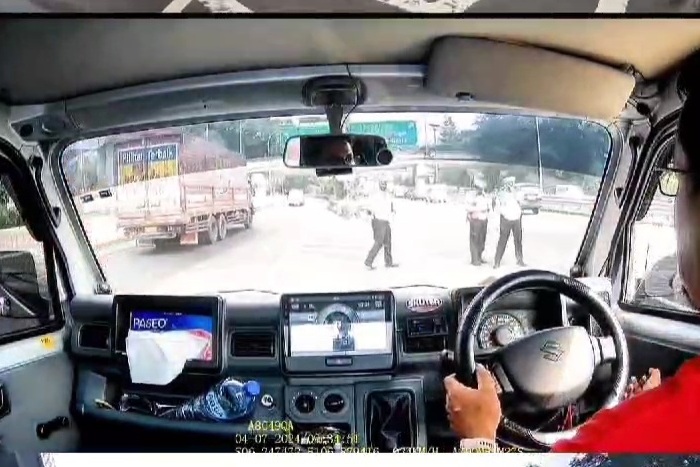 Peristiwa terjadi di ruas Tol Halim, Jakarta Timur. Terlihat mobil jenis pickup dihentikan oleh anggota Polantas. Dia disebut melanggar marka jalan. Petugas kemudian meminta meminta SIM milik sopir itu.